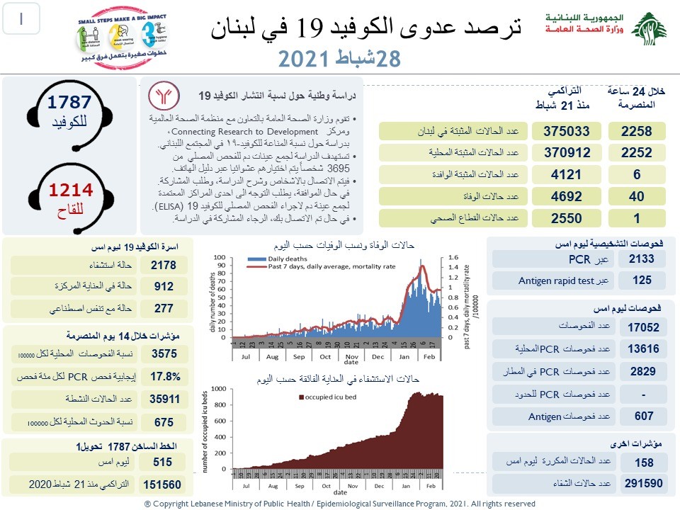 لبنان_الكوثر: أعلنت وزارة الصحة اللبنانية الأحد انه تم تسجيل 40 وفاة و2258 إصابة جديدة بوباء كورونا خلال الـ24 ساعة الماضية.