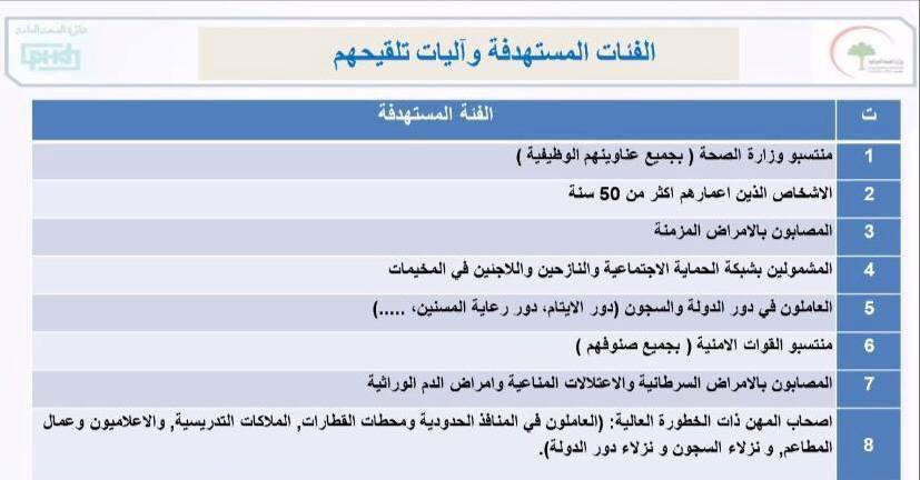 وقال المتحدث باسم وزارة الصحة ان "ان هذه الفئات تم تحديدهم من قبل خبراء الصحة العامة وهم الاكثر عرضة للاصابة بفيروس كورونا مثل الملكات الطبية والصحية بحكم عملهم والقوات الامنية والاعلامية وسيتم تلقيحهم بالتوازي".
