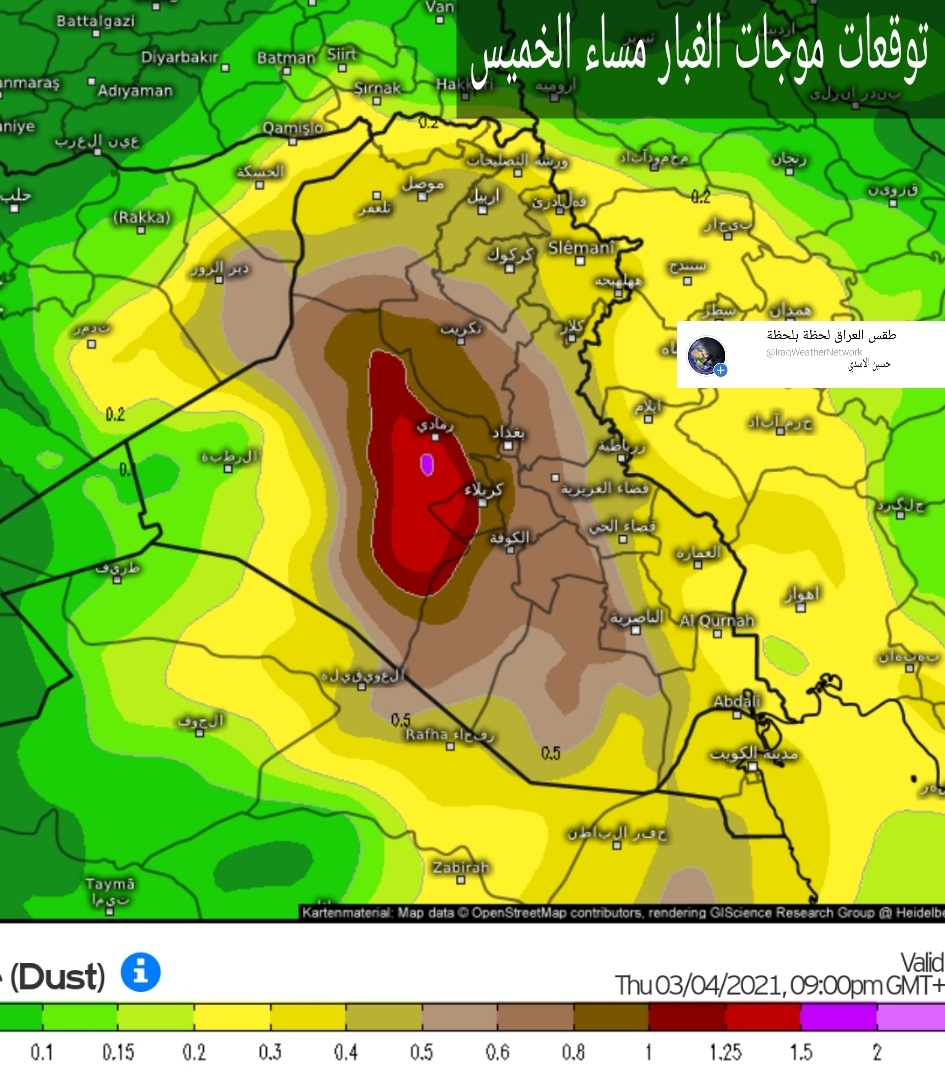وحذر من "نشاط الرياح الجنوبية الشرقية حيث متوقع تحول الرياح إلى جنوبية شرقية خفيفة من اليوم الأربعاء، الى معتدلة السرعة ومن يوم الخميس، هناك نشاط في الرياح الجنوبية الشرقية في كافة المناطق ومع دخول الكتلة الهوائية الباردة المصاحبة للمنخفض الجوي تتحول الرياح بدأ من ظهر الخميس، على المنطقة الغربية نشطة السرعة وبشكل تدريجي تتحول في مناطق وسط البلاد عصر ومساء الخميس تصل هبات الرياح إلى 80 كلم تتشكل على أثرها موجة غبار تنطلق من المنطقة الغربية وتتحرك بإتجاه مناطق وسط البلاد وتصل إلى مناطق الجنوب بشكل أقل لذلك وجب التنبيه".