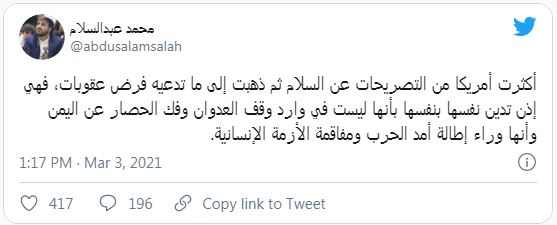 وقال عبدالسلام في تغريدة له على تويتر " أكثرت أمريكا من التصريحات عن السلام ثم ذهبت إلى ما تدعيه فرض عقوبات، فهي إذن تدين نفسها بنفسها بأنها ليست في وارد وقف العدوان وفك الحصار عن اليمن وأنها وراء إطالة أمد الحرب ومفاقمة الأزمة الإنسانية.