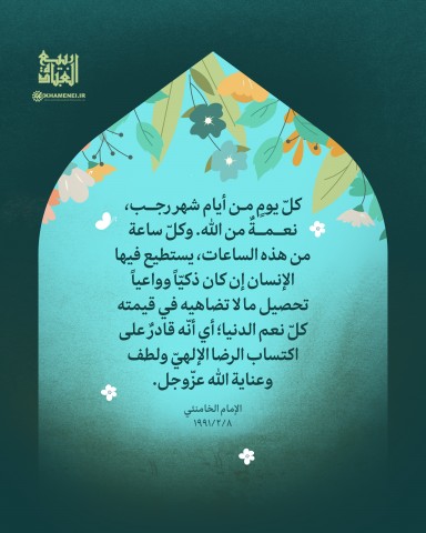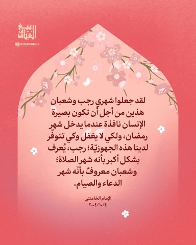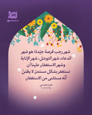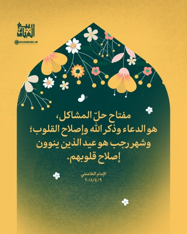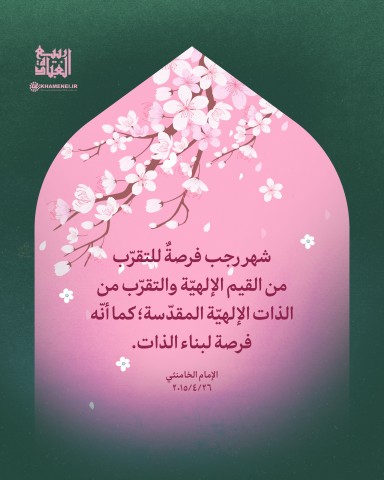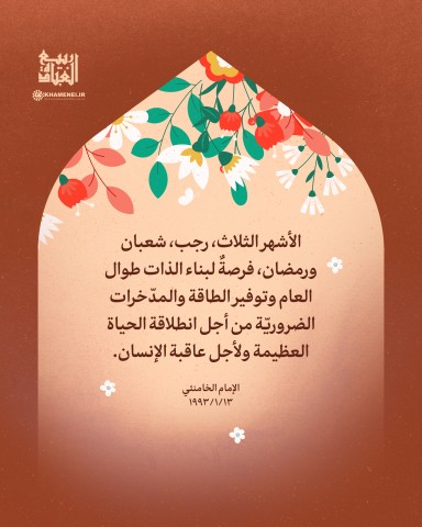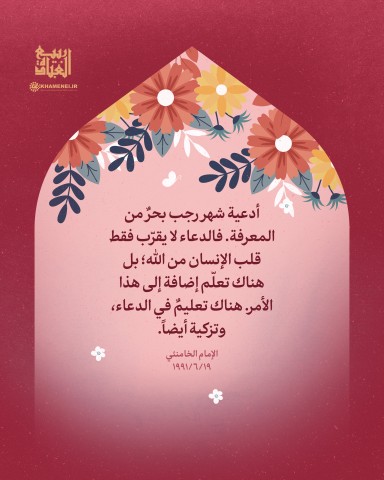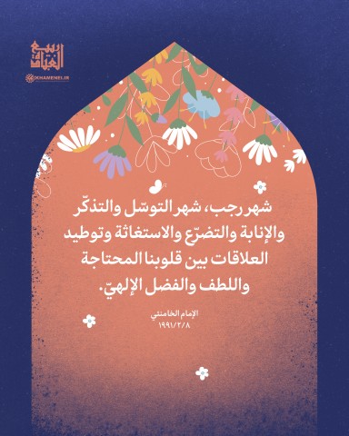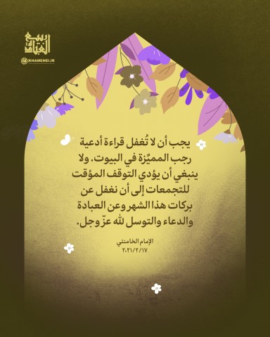 يجب أن لا تُغفل قراءة أدعية رجب المميٌزة في البيوت. ولا ينبغي أن يؤدي التوقف المؤقت للتجمعات إلى أن نغفل عن بركات هذا الشهر وعن العبادة والدعاء والتوسل لله عزّ وجل. 17/2/2021 شهر رجب، ربيع العبادة والتضرّع والتوسّل إلى الله. 16/7/2008 شهر رجب، شهر التوسّل والتذكّر والإنابة والتضرّع والاستغاثة وتوطيد العلاقات بين قلوبنا المحتاجة واللطف والفضل الإلهيّ. 8/2/1991 كلّ يومٍ من أيام شهر رجب، نعمةٌ من الله. وكلّ ساعة من هذه الساعات، يستطيع فيها الإنسان إن كان ذكيّاً وواعياً تحصيل ما لا تضاهيه في قيمته كلّ نعم الدنيا؛ أي أنّه قادرٌ على اكتساب الرضا الإلهيّ ولطف وعناية الله عزّوجل. 8/2/1991 أدعية شهر رجب بحرٌ من المعرفة. فالدعاء لا يقرّب فقط قلب الإنسان من الله؛ بل هناك تعلّم إضافة إلى هذا الأمر. هناك تعليمٌ في الدعاء، وتزكية أيضاً. 19/6/2009 الأشهر الثلاث، رجب، شعبان ورمضان، فرصةٌ لبناء الذات طوال العام وتوفير الطاقة والمدّخرات الضروريّة من أجل انطلاقة الحياة العظيمة ولأجل عاقبة الإنسان. 13/1/1993 لقد جعلوا شهري رجب وشعبان هذين من أجل أن تكون بصيرة الإنسان نافذة عندما يدخل شهر رمضان، ولكي لا يغفل وكي تتوفّر لدينا هذه الجهوزيّة؛ رجب، يُعرف بشكل أكبر بأنه شهر الصلاة؛ وشعبان معروفٌ بأنّه شهر الدعاء والصيام. 4/10/2004 شهر رجب فرصةٌ للتقرّب من القيم الإلهيّة والتقرّب من الذات الإلهيّة المقدّسة؛ كما أنّه فرصة لبناء الذات. 26/4/2015 شهر رجب فرصة جيّدة؛ هو شهر الدعاء، شهر التوسّل، شهر الإنابة وشهر الاستغفار. علينا أن نستغفر بشكل مستمرّ. لا يظننّ أنّه مستثنى من الاستغفار. 24/6/2009 توصية خاصّة بإيقاف مراسم الاعتكاف بسبب تفشّي فيروس كورونا أقيموا صلاة جعفر الطيّار يُفضّل أن يقيم أولئك الذين حُرموا من عمل الاعتكاف الفضيل في الأيام البيض من شهر رجب صلاة جعفر الطيار في كلّ يوم من هذه الأيام الثلاثة. 8/3/2020 مفتاح حلّ المشاكل، هو الدعاء وذكر الله وإصلاح القلوب؛ وشهر رجب هو عيد الذين ينوون إصلاح قلوبهم. 9/4/2018