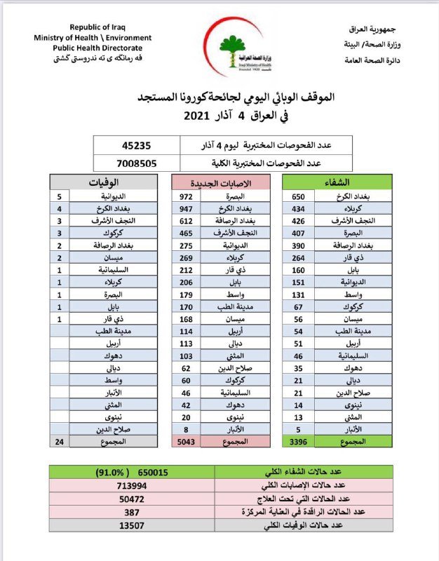 وبحسب الموقف فإن مختبرات وزارة الصحة سجلت 5043 اصابة جديدة بفيروس كورونا، فيما سجلت 3396 حالة شفاء من الفيروس، فضلاً عن 24 اربع حالة وفاة.