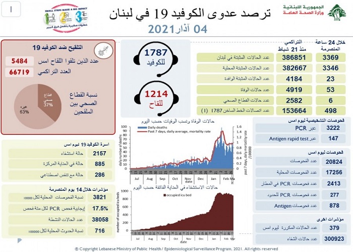 وذكرت أنّ "عدد حالات الاستشفاء ليوم أمس هو 2157، من بينها 885 حالة في العناية المركّزة"، لافتةً إلى أنّ "عدد الفحوصات المخبريّة ليوم أمس هو 20824، منها 2413 فحصًا في المطار".
