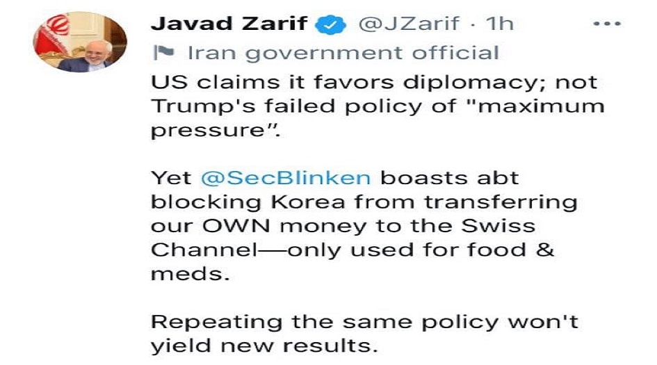 وتابع ظريف : لكن وزير الخارجية الامريكي (الحالي) انطوني بلينكن، يتحدث بكل فخر عن الحؤول دون تحويل اصولنا عبر القناة السويسرية لاستخدامها في مجال شراء الادوية والغذاء فقط.