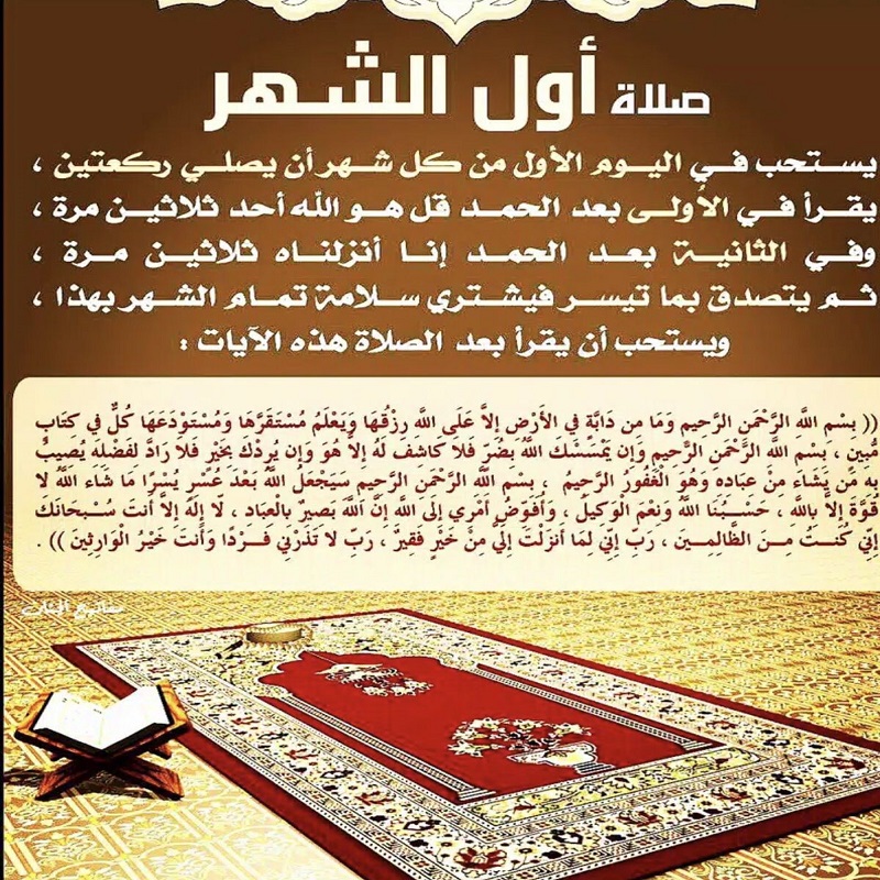 يستحب في اليوم الأول من كل شهر أن يصلي ركعتين ، يقرأ في الاُولى بعد الحمد قل هو الله أحد ثلاثين مرة ، وفي الثانية بعد الحمد إنا أنزلناه ثلاثين مرة ، ثم يتصدق بما تيسر فيشتري سلامة تمام الشهر بهذا ،