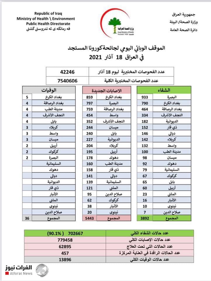 وبحسب الموقف الوبائي لوزارة الصحة خلال الـ 24 ساعة الماضية فانها سجلت 5443 إصابة جديدة و 36 وفاة و بلغت حالات الشفاء 3892 حالة.