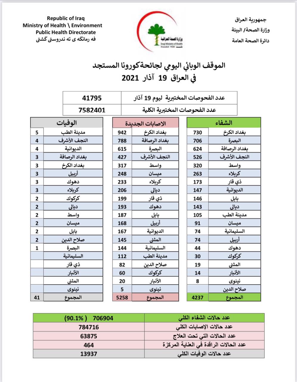 وقالت الوزارة في بيان ، إنها "سجلت 5258 إصابة جديدة بفيروس كورونا، مقابل تماثل 4237 حالة للشفاء، و 41 وفاة".