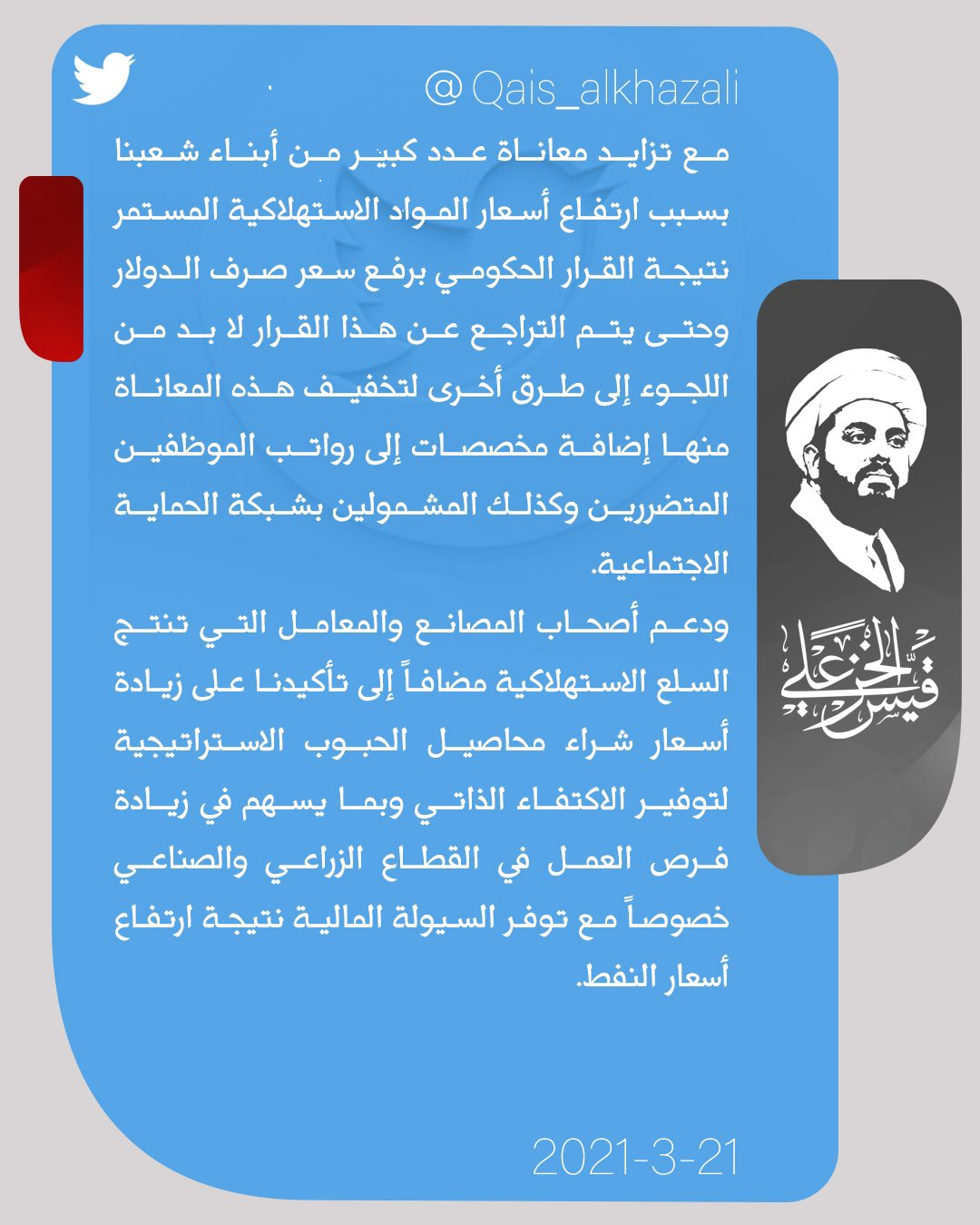 وقال الشيخ الخزعلي في تغريدة على تويتر (21 اذار 2021)، انه "مع تزايد معاناة عدد كبير من ابناء شعبنا بسبب ارتفاع اسعار المواد الاستهلاكية المستمر نتيجة القرار الحكومي برفع سعر صرف الدولار وحتى يتم التراجع عن هذا القرار لا بد من اللجوء الى طرق اخرى لتخفيف هذه المعاناة".
