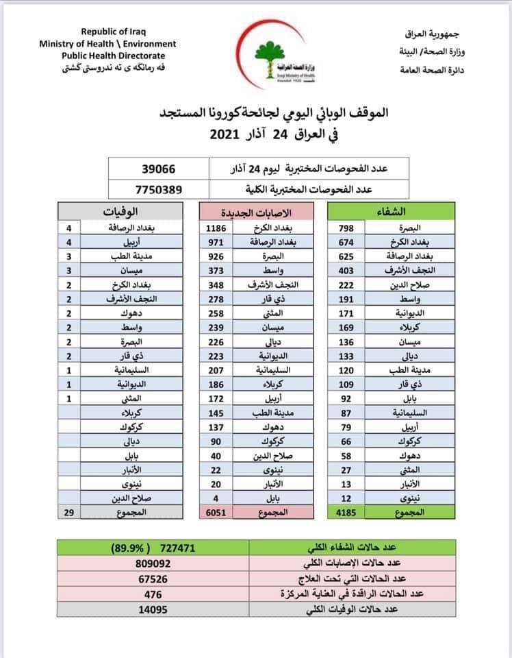 وقالت الوزارة في بيان ، إن "العراق سجل اليوم، 6051 إصابة جديدة بالفيروس، و 4185 حالة شفاء، مقابل 29 وفاة بالفيروس".