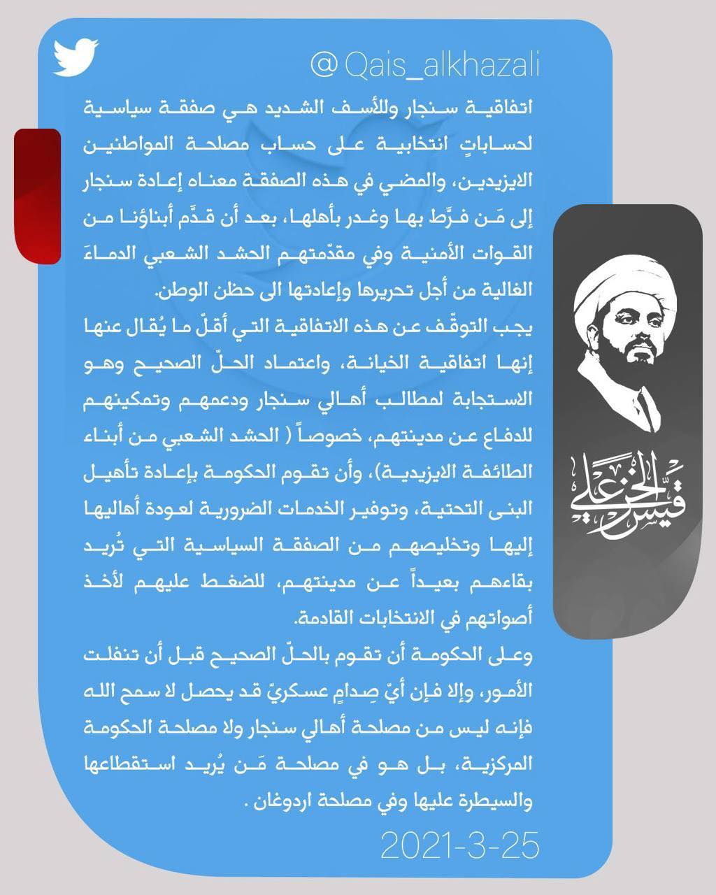 العراق_الكوثر: انتقد الامين العام لعصائب اهل الحق، الشيخ قيس الخزعلي، أمس الخميس، اتفاق سنجار المبرم بين الحكومة العراقية وكردستان مؤكدا ان الاتفاق صفقة سياسية لحسابات انتخابية.