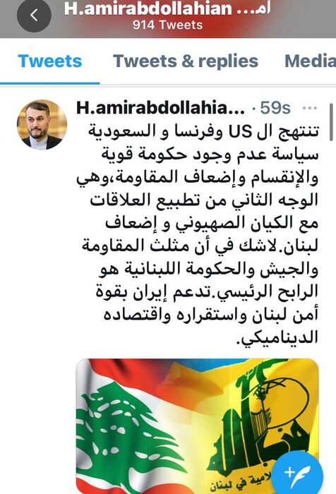 وفي تغريده له اليوم (الجمعة) بالعربية، كتب أمير عبداللهيان: تنتهج كل من الولايات المتحدة وفرنسا والسعودية سياسة عدم وجود حكومة قوية والانقسام واضعاف المقاومة (في لبنان) وهي الوجه الثاني من تطبيع العلاقات مع الكيان الصهيوني وإضعاف لبنان.
