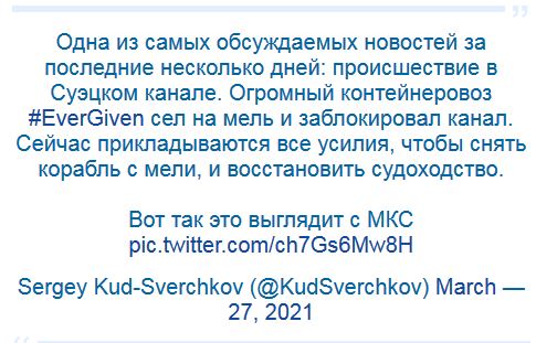 وكتب على "تويتر": "من أكثر الأخبار التي تم تداولها في الأيام الماضية حادثة قناة السويس حيث جنحت سفينة الحاويات الضخمة (إيفر غرين) وسدت القناة.. تبذل الآن كل الجهود الممكنة لانتشال السفينة واستعادة طريق الشحن في القناة".