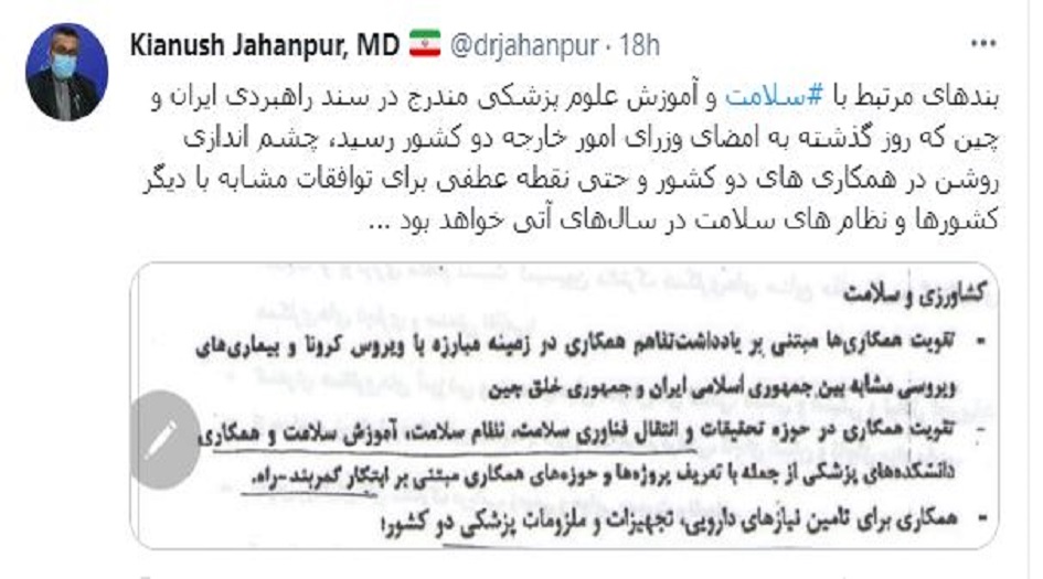 وارفق هذا المسؤول في وزارة الصحة الايرانية، تغريدته بعدد من بنود وثيقة التعاون الستراتيجي بين ايران والصين، والتي يشير البعض منها الى تعزيز مجالات التعاون في اطار مذكرة التفاهم الثنائية لمكافحة فيروس كورونا والامراض المعدية المماثلة.