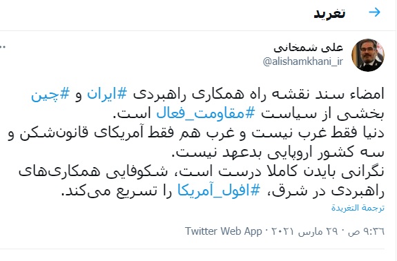 وقال علي شمخاني في تغريدة نشرها اليوم الاثنين على حسابه في موقع تويتر للتواصل الاجتماعي، إن قلق بايدن في محله تماما، لأن ازدهار التعاون الاستراتيجي في الشرق يسرع في افول أميركا.