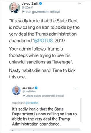 ويفيد تقرير وكالة انباء فارس ان وزير خارجية الجمهورية الإسلامية الإيرانية محمد جواد ظريف غرد اليوم (الثلاثاء): "من المؤسف والسخرية أن وزارة الخارجية الأميركية تريد الآن من ايران أن تلتزم بنفس الاتفاقية التي انسحبت منها إدارة ترامب ".