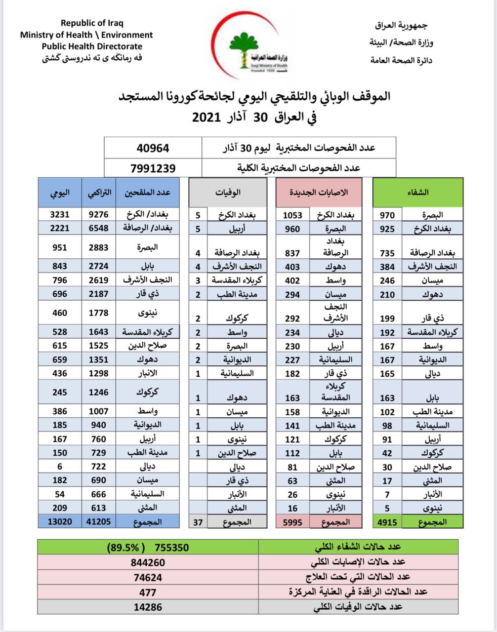 وقالت الوزارة في بيان ، إنها "سجلت 5995 إصابة جديدة بكورونا، مقابل تماثل 4915 حالة جديدة للشفاء، مع تسجيل 37 حالة وفاة".