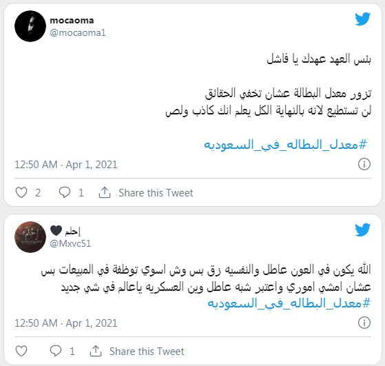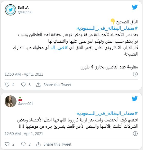 تقرير الإقتصادية كذّبه مغردون سعوديون بتويتر اذ قالوا ان معدلات البطالة في السعودية لا زالت على حالها ولم تتغير وسياسة توطين الوظائف فاشلة بكل المقاييس فكورونا تسبب بشلل الإقتصاد وبعض الشركات أعلنت إفلاسها والبعض الآخر قامت بتسريح جزء من موظفيها, فعن اي انخفاض لمعدلات البطالة يتحدثون.