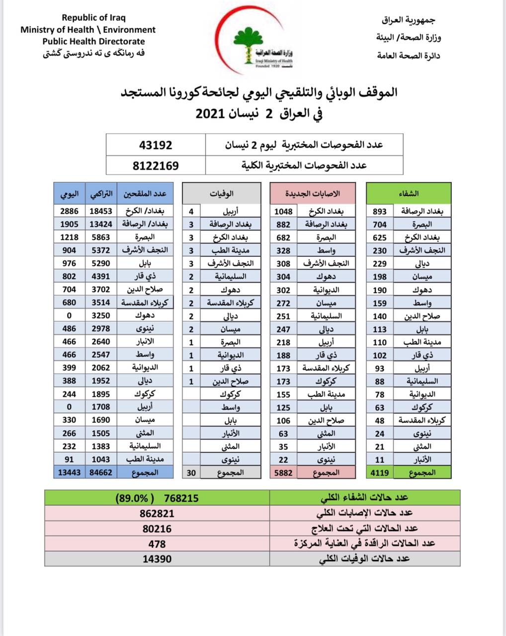 وقالت الوزارة في بيان ، إنها "سجلت إصابة 5882 حالة، مقابل 4119 حالة شفاء، و 30 حالة وفاة بالفيروس". وأشارت إلى "تلقي 13443 شخصاً للقاح كورونا".