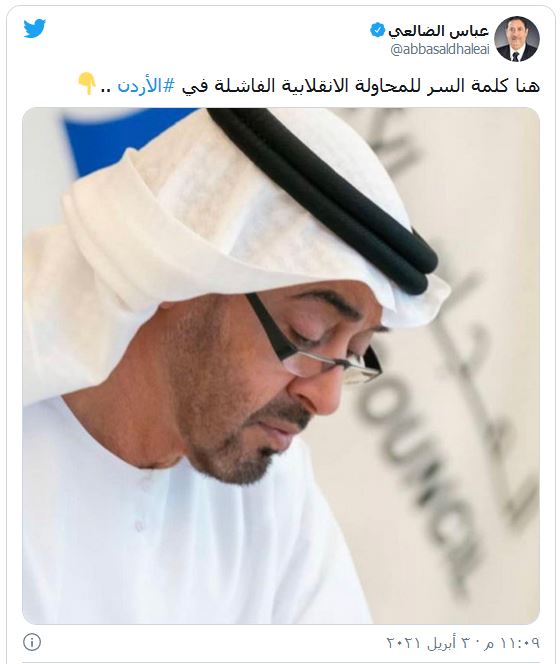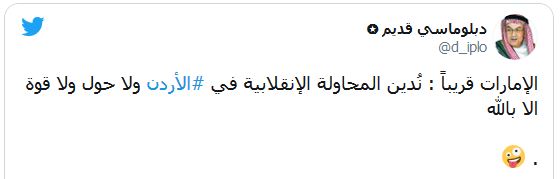 من جانبه سخر حساب دبلوماسي قديم من الإمارات مشيرا بالاتهام لمحمد بن زايد في التورط بهذه المحاولة الانقلابية، وكتب. :”الإمارات قريباً : ندين المحاولة الإنقلابية في الأردن ولا حول ولا قوة الا بالله”.