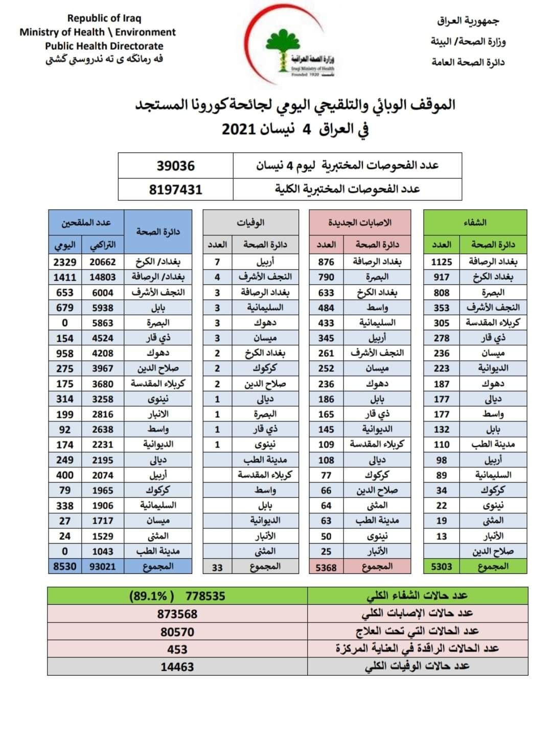 العراق_الكوثر: أعلنت وزارة الصحة، اليوم الأحد، الموقف الوبائي الخاص بجائحة كورونا في عموم العراق.