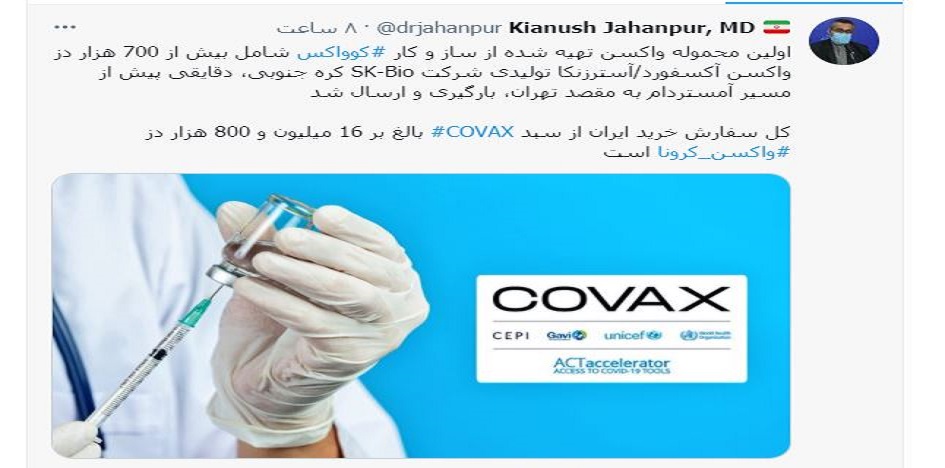 وكتب جهانبور في تغريدة له على موقع التواصل الاجتماعي "تويتر" تم قبل قليل شحن وارسال اول شحنة في اطار آلية "كوفاكس" وتشمل اكثر من 700 الف جرعة من لقاح "اكسفورد استرازينيكا" المنتج من قبل شركة SK-Bio الكورية الجنوبية عبر امستردام الى طهران.