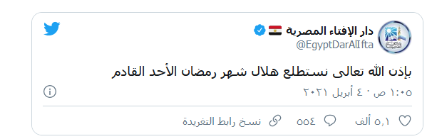 وقالت دار الإفتاء المصرية عبر حساباتها على مواقع التواصل الاجتماعي إنه سيتم استطلاع هلال شهر رمضان الأحد المقبل الموافق 11 نيسان/ أبريل الجاري.