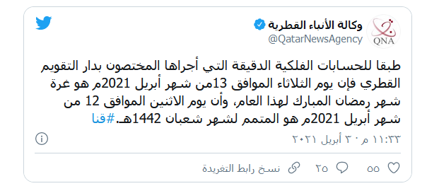 وكانت دول عربية منها قطر أعلنت عن أن أول أيام شهر رمضان سيكون يوم الثلاثاء الموافق 13 أبريل.