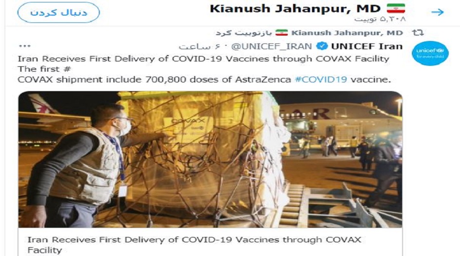 وكتب جهانبور في تغريدة له على موقع التواصل الاجتماعي "تويتر" مساء الاثنين: وصلت الى طهران اول شحنة لقاح كورونا في اطار آلية "كوفاكس" بتاخير 3 اسابيع عن الموعد المقرر.