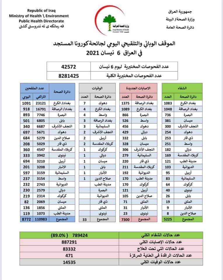وقالت الوزارة في بيان، إنها "سجلت 7300 حالة إصابة، مقابل 5225 حالة شفاء، و33 وفاة جراء الفيروس". وأشارت إلى "تسجيل 8772 شخصاً تلقى لقاح الوباء".
