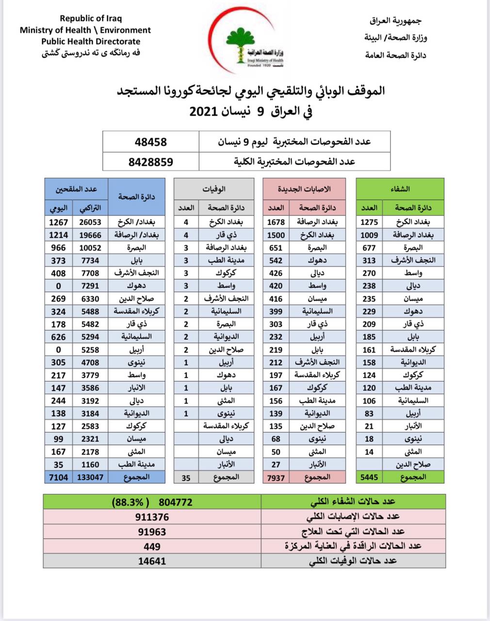 وقالت الوزارة في بيان ، إنها "سجلت 7937 إصابة جديدة بكورونا، مقابل تماثل 5445 حالة جديدة للشفاء، مع تسجيل 35 حالة وفاة". وأشارت الصحة إلى "تلقي 7104 أشخاص للقاح كورونا في يوم واحد".