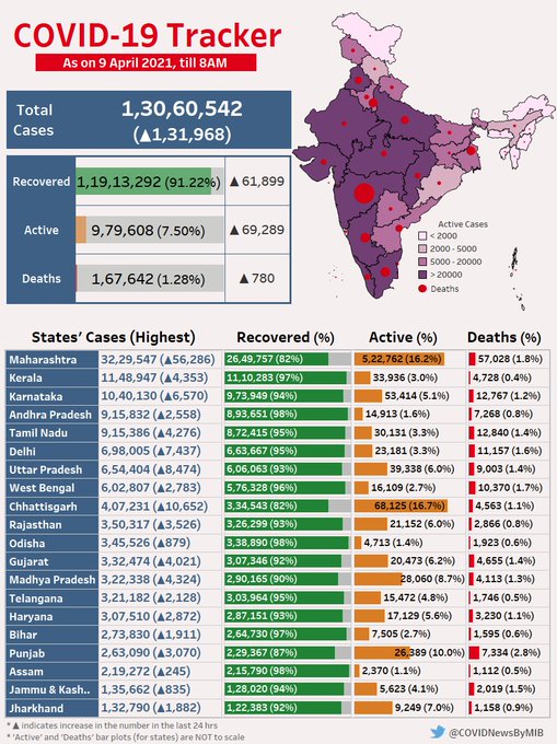 وأكدت وزارة الصحة اليوم الجمعة رصد 780 وفاة و131968 إصابة جديدة بالعدوى خلال الساعات الـ24 الماضية، فيما تماثل 61899 مريضا للشفاء.