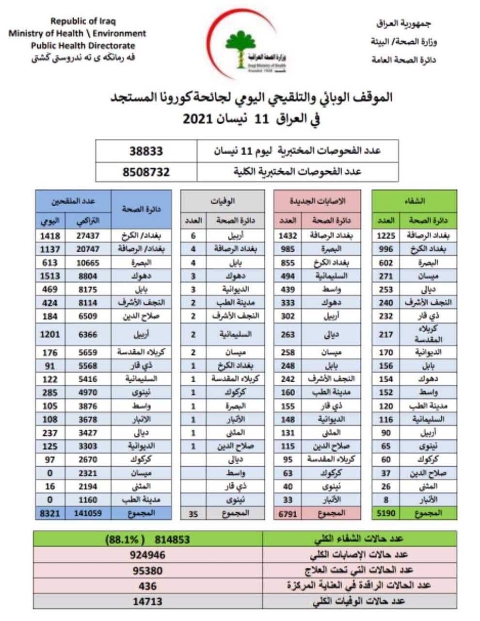 وقالت الوزارة في بيان ، إن "الكوادر الصحية سجلت 6791 إصابة جديدة بالفيروس، فيما تماثل 5190 مصاباً للشفاء، وقابل ذلك وفاة 35 مصاباً بالفيروس خلال المدة المذكورة".