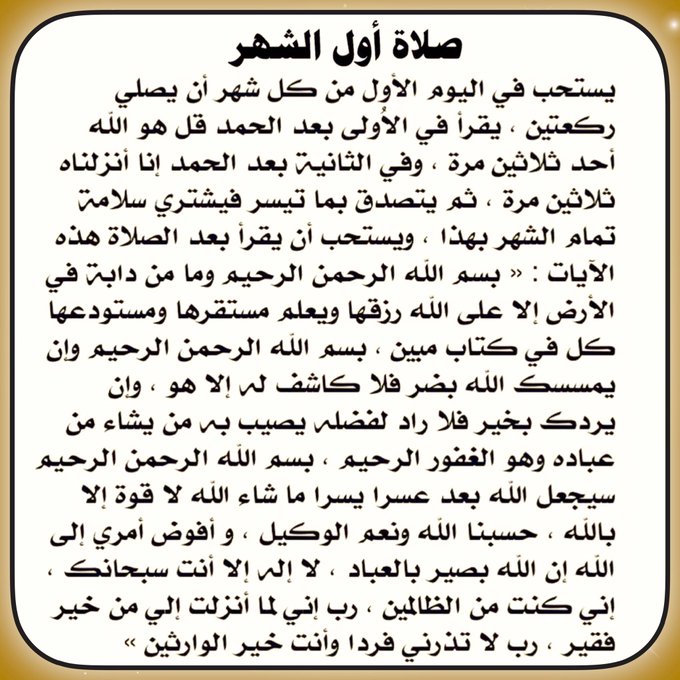 يستحب في اليوم الأول من كل شهر أن يصلي ركعتين ، يقرأ في الاُولى بعد الحمد قل هو الله أحد ثلاثين مرة ، وفي الثانية بعد الحمد إنا أنزلناه ثلاثين مرة ، ثم يتصدق بما تيسر فيشتري سلامة تمام الشهر بهذا ،