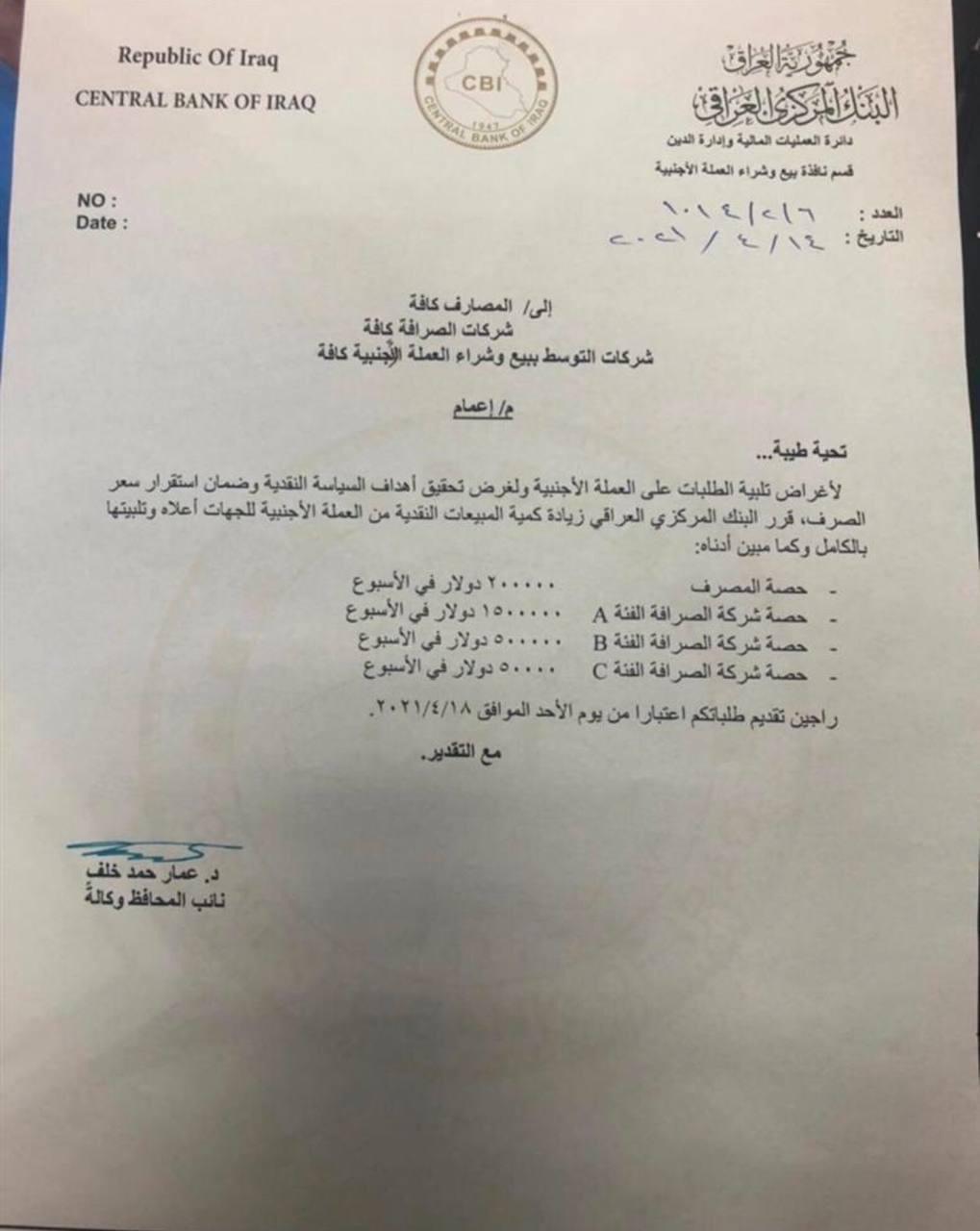 وبحسب وثيقة (14 نيسان 2021)، فقد عزا البنك قراره الى ضرورة تلبية الطلبات على العملة الاجنبية وكذلك من اجل تحقيق اهداف السياسة النقدية وضمان استقرار سعر الصرف.