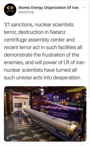 في تغريدة على تويتر اليوم الاربعاء، اشارت منظمة الطاقة الذرية الى الاعمال الارهابية المعادية ضد الصناعة النووية للجمهورية الاسلامية الايرانية والعمل التخريبي الاخير ضد منشأة الشهيد احمدي روشن لتخصيب اليورانيوم في نطنز، وقالت : إن الحظر واغتيال العلماء النوويين وتخريب قاعة تجميع أجهزة الطرد المركزي في نطنز والهجوم الإرهابي الأخير على المنشأة، يظهر فقط فشل أعداء إيران الإسلامية، وان إرادة علماء الصناعة النووية حولت كل هذه الاعمال الدنيئة الى يأس.