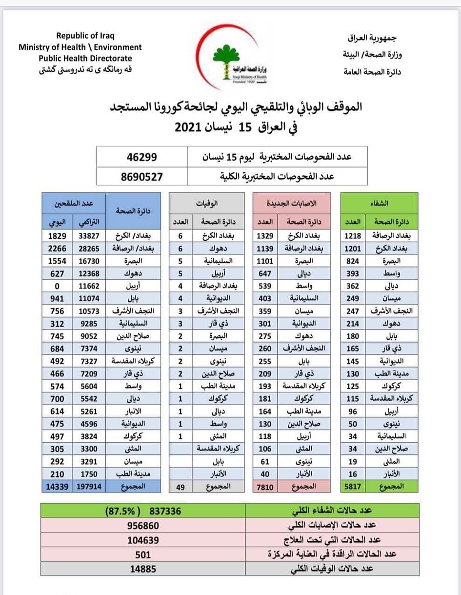 وبلغ عدد الإصابات بحسب الموقف الوبائي 7810 إصابات جديدة، أما عدد حالات الشفاء فكانت 5817.