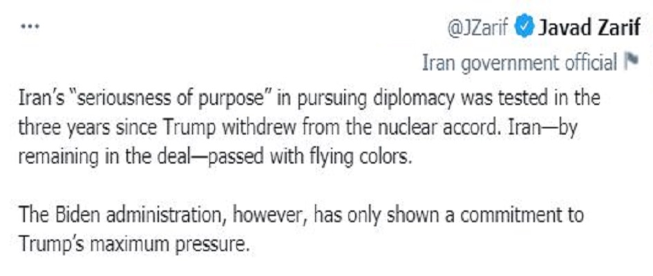 واضاف وزير الخارجية في تغريدة عبر حسابه بموقع تويتر اليوم الخميس: ان ايران عبر التزامها الجاد بمتابعة الدبلوماسية على مدى ثلاث سنوات مضت منذ انسحاب ترامب من الاتفاق النووي، اجتازت الاختبار بنجاح حاسم.