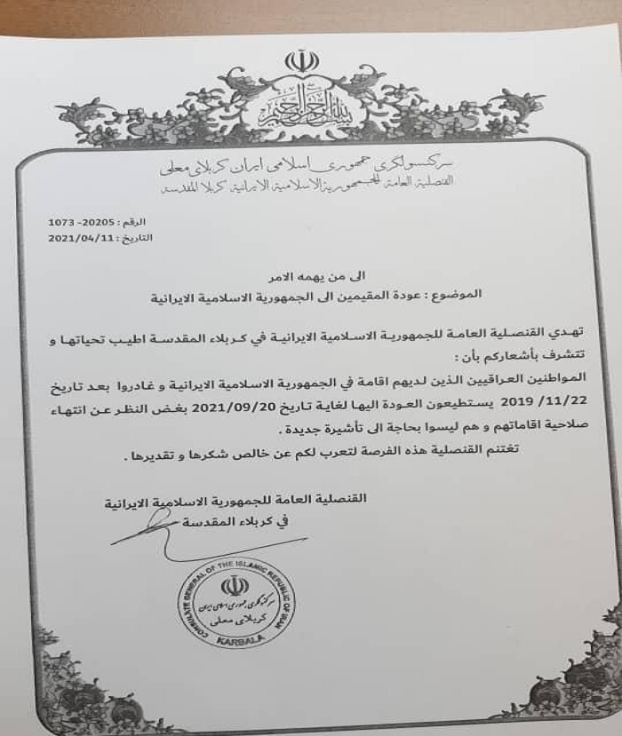 بالوثيقة.. القنصلية الايرانية في العراق تزف خبراً ساراً للعراقيين المقيمين في ايران