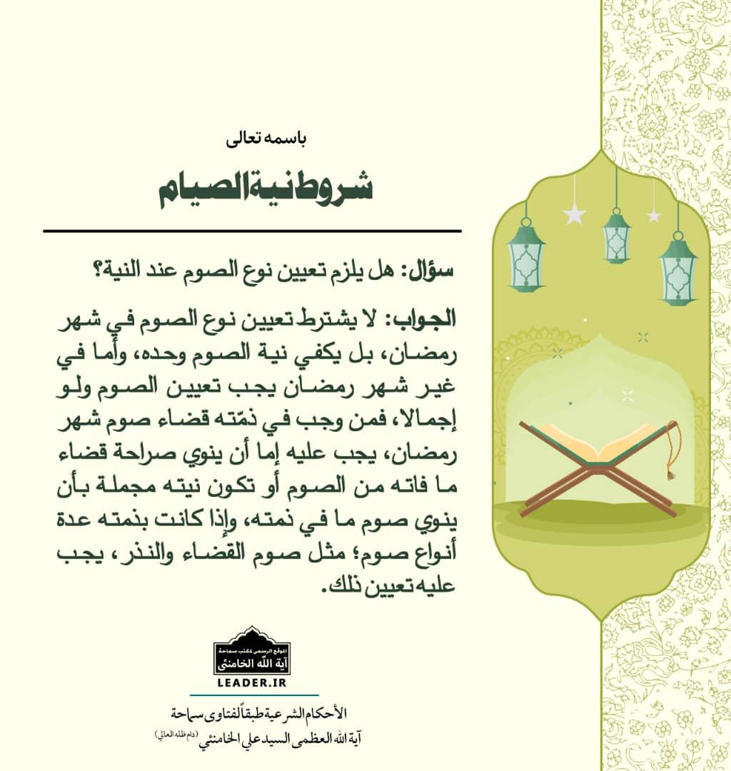 الجواب: لا يشترط تعيين نوع الصوم في شهر رمضان، بل يكفي نية الصوم وحده ،وأما في غير شهر رمضان يجب تعيين الصوم ولو اجمالا، فمن وجب في ذمته قضاء صوم شهر رمضان ،يجب عليه ان ينوي صراحة قضاء ما فاته من الصوم او تكون نيته مجملة بان ينوي صوم ما في ذمته، واذا ما كانت بذمته عدة انواع صوم ،مثل صوم القضاء او النذر يجب عليه تعيين ذلك.