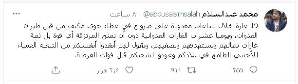 وفي تغريدة له مساء امس السبت، قال عبدالسلام: "19 غارة خلال ساعات معدودة على صرواح في غطاء جوي مكثف من قبل طيران العدوان، ويوميا عشرات الغارات العدوانية دون أن تمنح المرتزقة أي قوة".