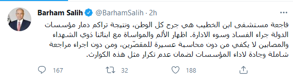 وقال صالح في تغريدة على تويتر ان "فاجعة مستشفى ابن الخطيب هي جرح كل الوطن، ونتيجة تراكم دمار مؤسسات الدولة جراء الفساد وسوء الادارة".