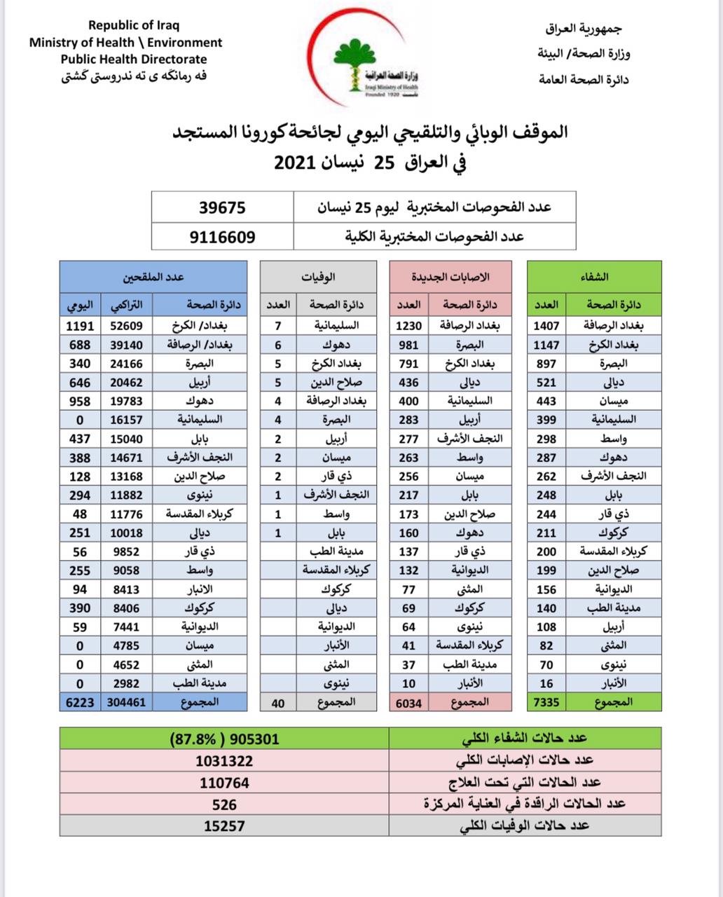 وقالت الوزارة في بيان ، إنها "سجلت 6034 حالة إصابة جديدة، مقابل 7335 حالة شفاء، و 40 حالة وفاة في عموم البلاد". وأشارت إلى "تلقي 6223 شخصاً للقاح كورونا في العراق".