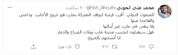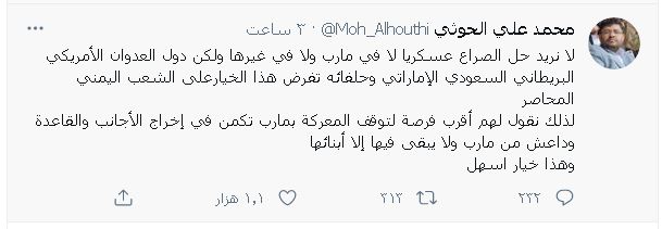 وأكد الحوثي في تغريدة له على تويتر: "لا نريد حل الصراع عسكريا لا في مأرب ولا في غيرها ولكن دول العدوان الأمريكي البريطاني السعودي الإماراتي وحلفائه تفرض هذا الخيارعلى الشعب اليمني المحاصر".