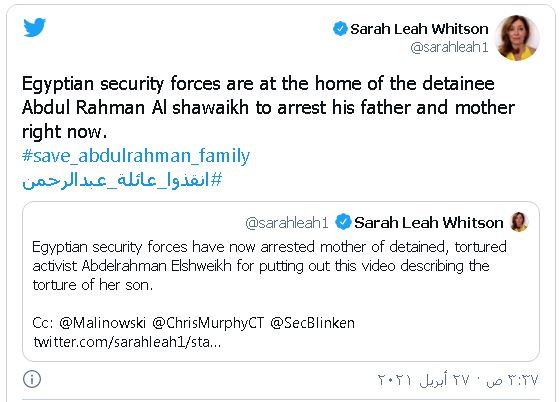 وقالت رئيسة قسم (غرب آسيا وشمال أفريقيا) لمنظمة هيومن رايتس ووتش "سارة ليا ويتسون"، في تغريدة لها اليوم الثلاثاء، إن الأمن المصري يتواجد حاليا في منزل المعتقل "عبد الرحمن الشويخ"؛ لاعتقال والده ووالدته.