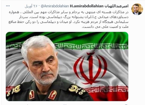 وورد في تغريدة كتبها حسين امير عبداللهيان على حسابه الشخصي في موقع تويتر: في المفاوضات التي انتهت بالاتفاق النووي والمفاوضات الدولية المهمة الأخرى كانت الانجازات الميدانية التي تحققها الجمهورية الإسلامية الإيرانية داعما كبيرا للدبلوماسية. وأضاف: إن الشهيد سليماني لم يدفع أي ثمن من الشعب مطلقا بل كان يعد الميدان والدبلوماسية ركنين للحفاظ على مصالح الشعب والأمن الوطني.
