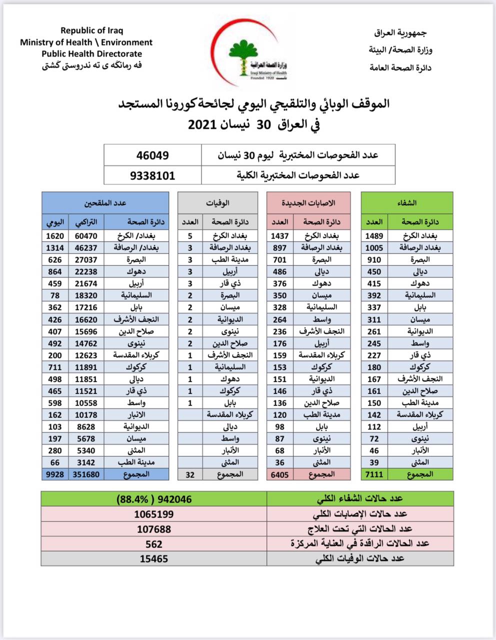 وقالت الوزارة في بيان ، إن "كوادرها سجلت 6405 إصابة جديدة، و 7111 حالة شفاء، و 32 وفاة بالفيروس في البلاد". وأشارت إلى " تلقي 9928 شخصاً للقاح كورونا في 24 ساعة".