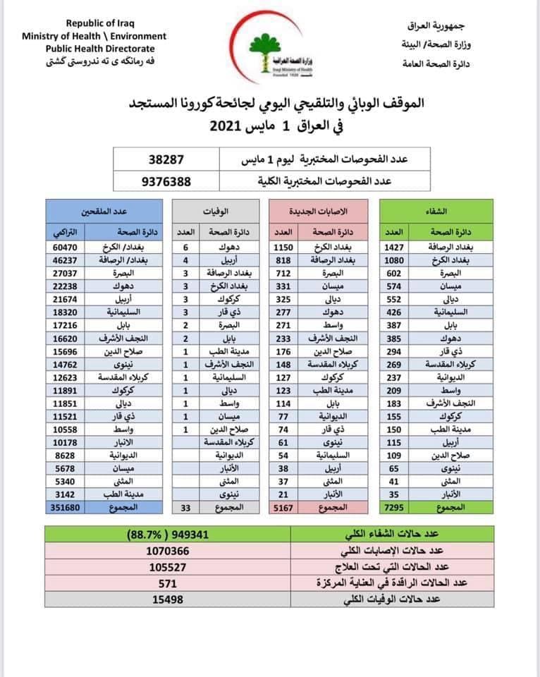 العراق_الكوثر: أعلنت وزارة الصحة، اليوم السبت، الموقف الوبائي الخاص بجائحة كورونا في عموم العراق.