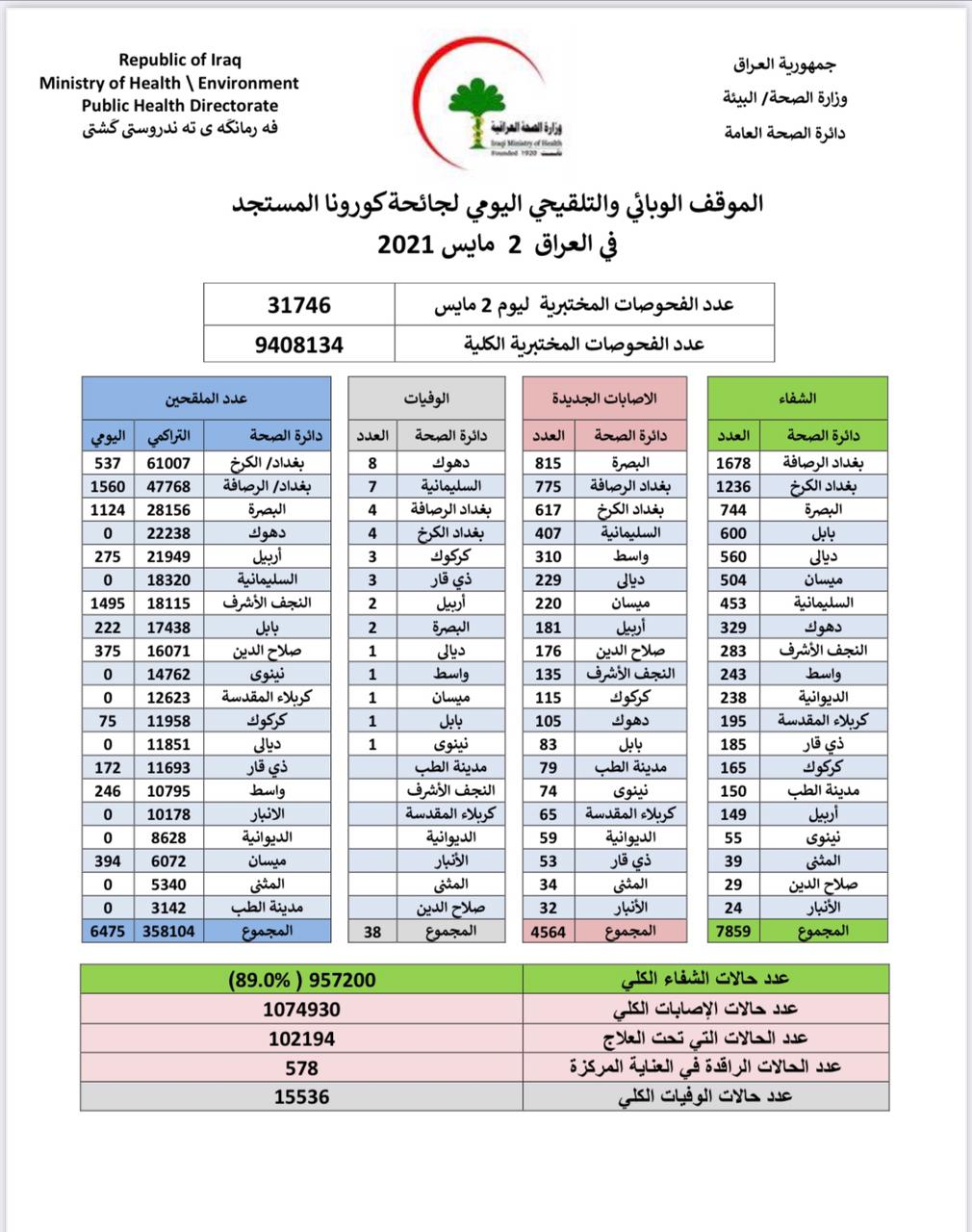 وقالت الوزارة في بيان، إن "كوادرها سجلت 4564 حالة إصابة جديدة، و 7859 حالة شفاء، و 38 وفاة".