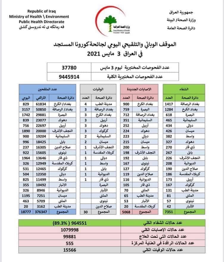 وقالت الوزارة في بيان ، إنها "سجلت 5068 حالة إصابة جديدة، مقابل تمثل 7351 حالة للشفاء، و 30 وفاة بالوباء". وأشارت إلى "تلقي 18777 شخصاً للقاح كورونا في عموم البلاد".