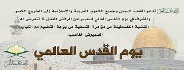 وقالت رابطة علماء اليمن في بيان إن : ذكرى يوم القدس العالمي ذكرى عالمية بكل ما تعنية الكلمة من معنى وما تتضمنه من دلالات ولا يمكن بحال أن تحصر أو تقصر هذه الذكرى على دولة أو شعب أو نظام.